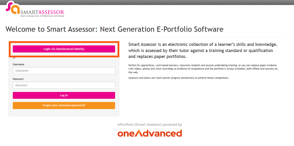If an Advanced ID from Identity is already associated with the account the user is trying to access, then Smart Assessor will present them with a reminder they can select the ‘Login via OneAdvanced Identity’ button. The user will then be directed to continue logging in via the Identity pages.