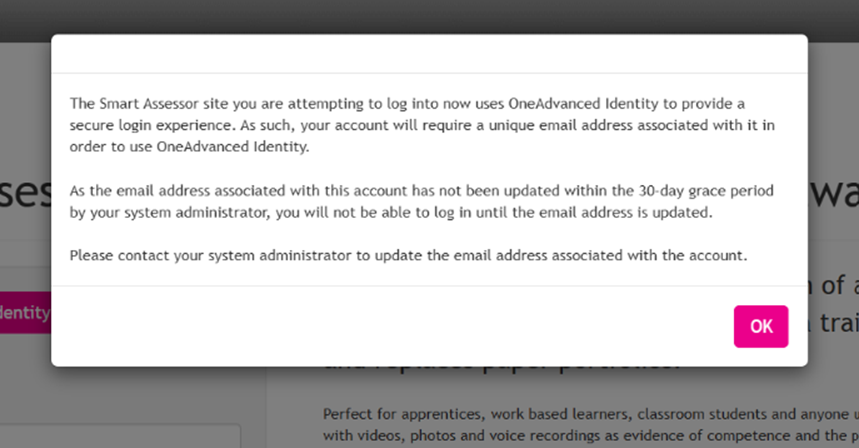 The user will then be presented with a message informing them they can now log into Smart Assessor using Identity and will encourage them to use the ‘Login via OneAdvanced Identity’ button on the Smart Assessor login screen moving forward.