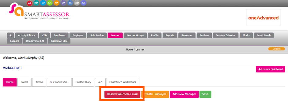 Assessors can log into Smart Assessor and go to the ‘Learners’ tab. After locating the learner and selecting their name, the Assessor can select ‘Resend Welcome Email’.